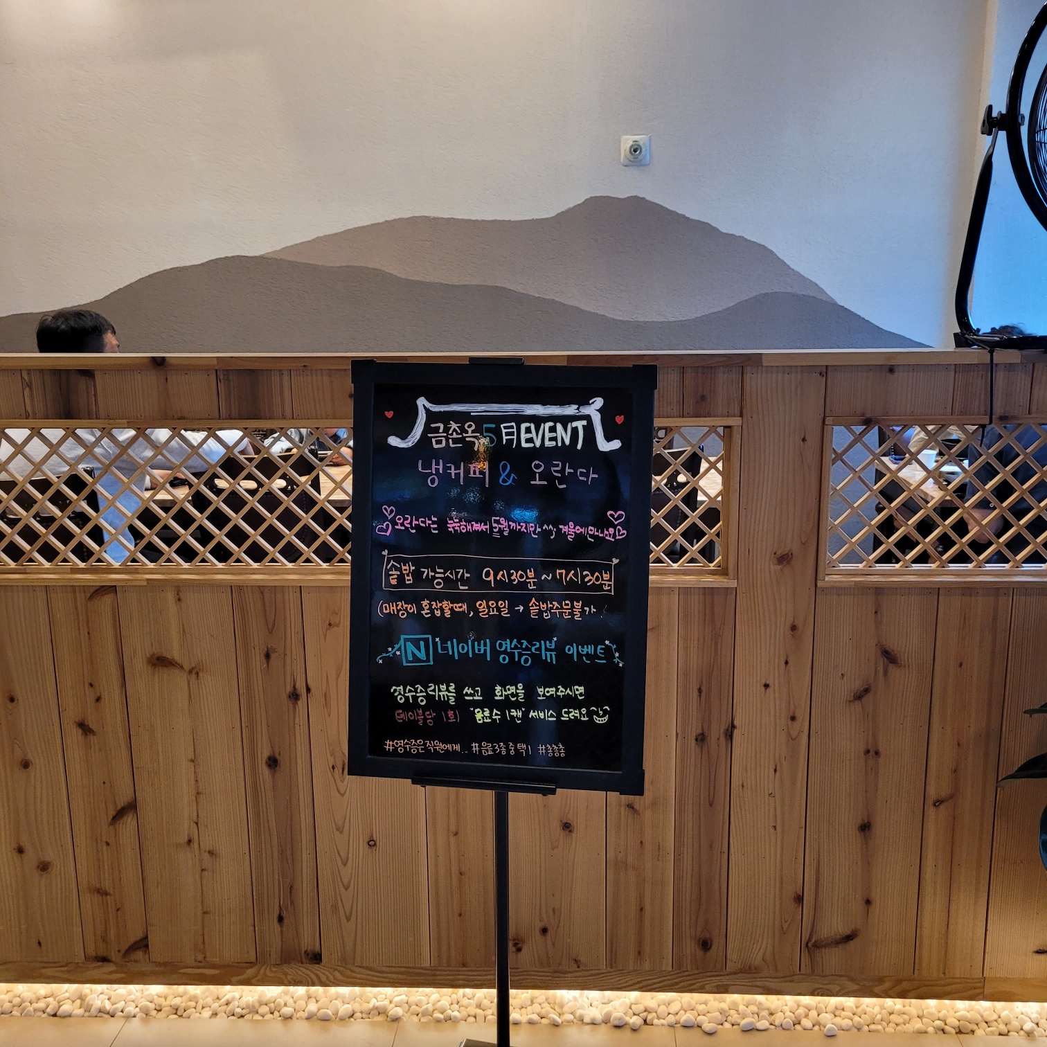 - 편의 : 단체석, 주차, 포장, 배달, 예약, 무선 인터넷, 남/녀 화장실 구분, 지역화폐(카드), 제로페이